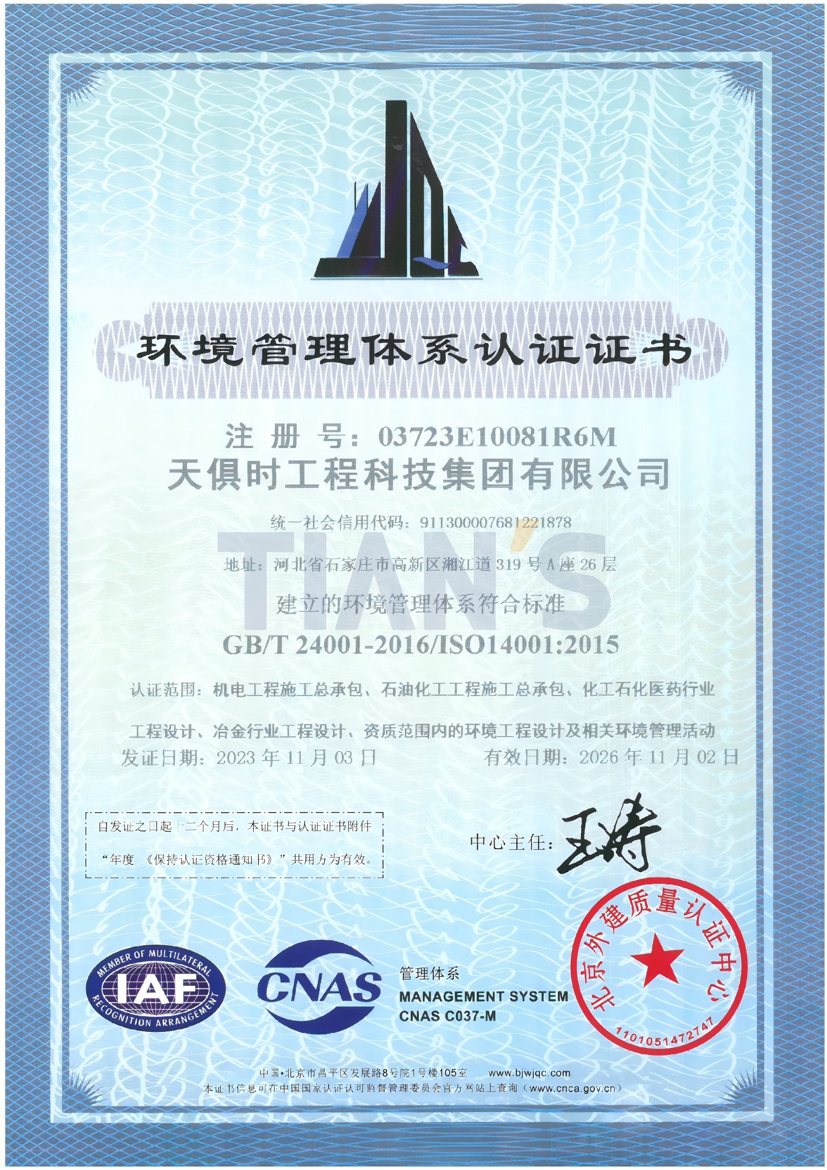 Grade II professional contracting of environmental protection engineering